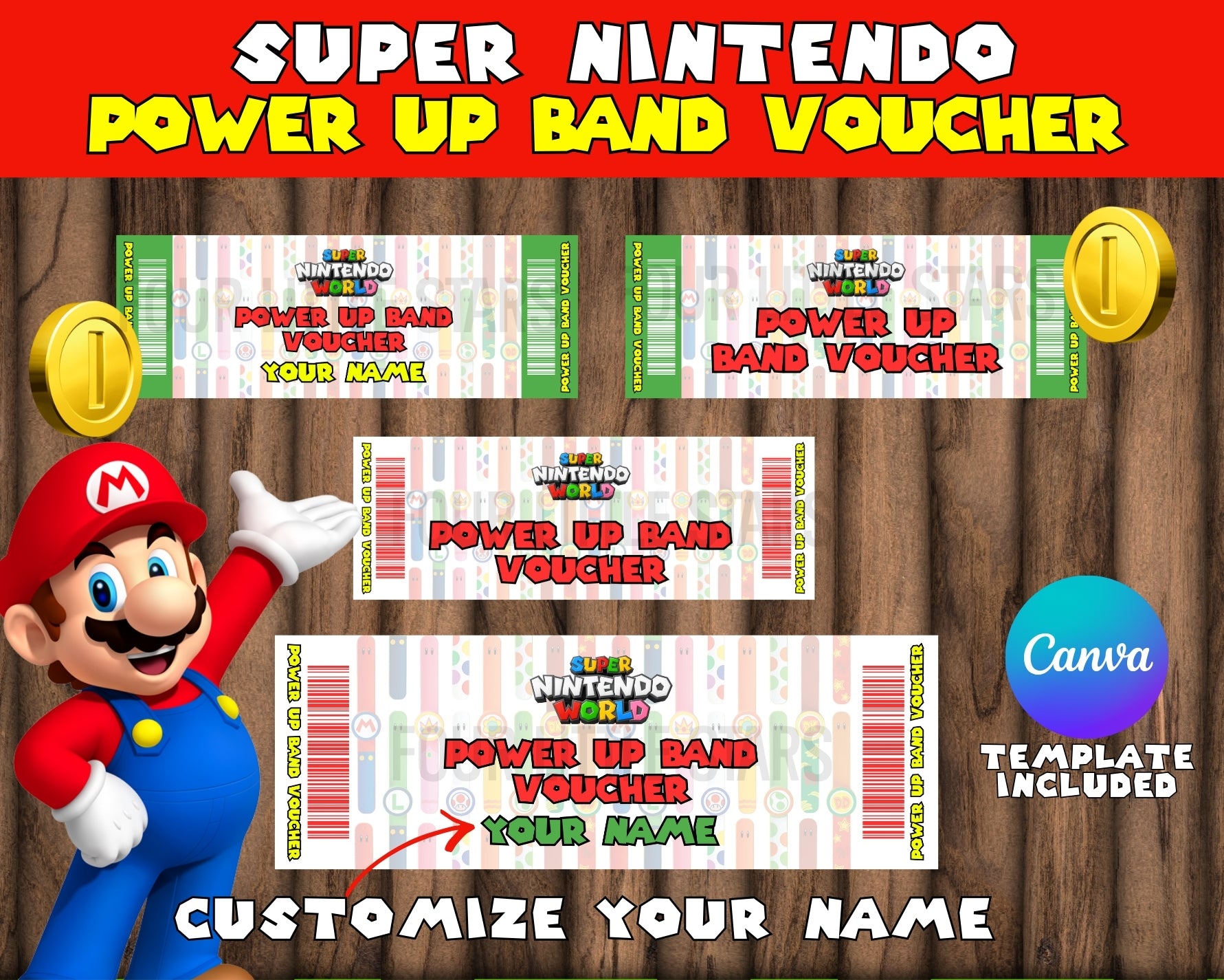 This is a printable novelty voucher only. It does not include a physical Power-Up Band and has no monetary value. It is designed purely for gifting, revealing, and building excitement before your Super Nintendo World adventure.